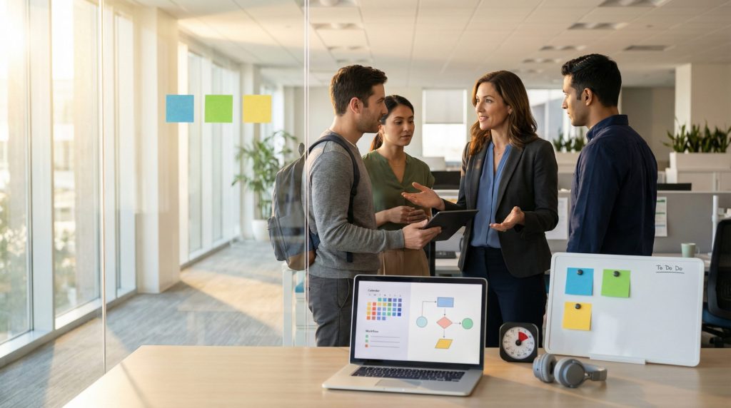Para reuniões, use agenda clara e temporeamento estrito. Convide apenas quem precisa decidir ou executar. Reuniões mais curtas mantêm foco e reduzem desperdício de tempo.